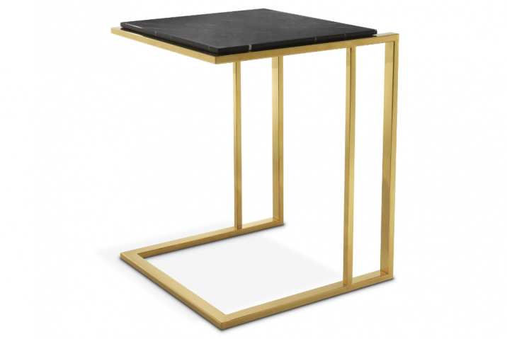 Das Gestell besteht aus poliertem goldfarbenen Edelstahl, die Tischplatte aus schwarzem Marmor.