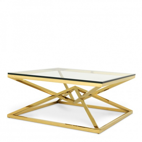 Entdecken Sie die Vielseitigkeit des Couchtischs Connor. Mit seinem glänzenden Pyramidenfuß bringt dieser Designertisch Glanz und Pracht in Ihre Einrichtung. Der auffällige geometrische Sockel aus Edelstahl ist mit einer glamourösen Goldoberfläche und einer Tischplatte aus klarem Glas versehen.